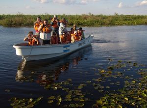 Wer Lust hat, kann sich am Vormittag einem kleinen Reitausflug in die Umgebung anschließen. In der Mittagshitze haben Sie die Möglichkeit sich im Wasser abzukühlen oder sich in unserer Lodge zu entspannen. Am Nachmittag unternehmen wir eine Bootsexkursion auf der riesigen Lagune zur Beobachtung der bis zu 300 Vogelarten und vieler größerer Säugetiere. Vor allem Wasserschweine und etliche sich in der Sonne aufwärmende Kaimane werden wir aus nächster Nähe zu Gesicht bekommen.